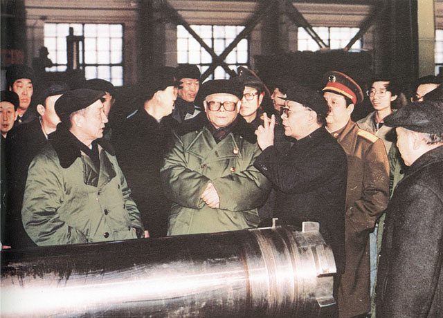 1990年2月17日中共中央總書(shū)記江澤民視察127廠時(shí)在車(chē)間聽(tīng)取匯報(bào)