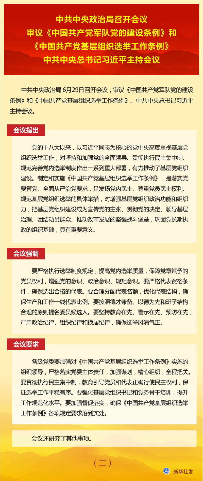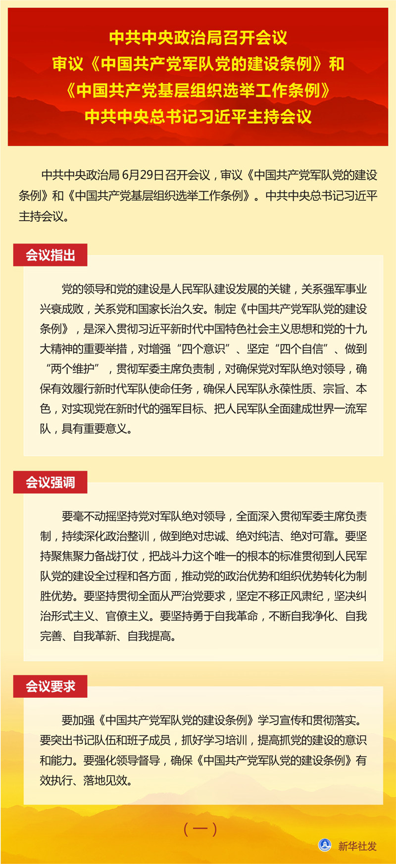 中共中央政治局召開會議 審議《中國共產(chǎn)黨軍隊黨的建設(shè)條例》和《中國共產(chǎn)黨基層組織選舉工作條例》 中共中央總書記習(xí)近平主持會議 新華社北京6月29日電 中共中央政治局6月29日召開會議,審議《中國共產(chǎn)黨軍隊黨的建設(shè)條例》和《中國共產(chǎn)黨基層組織選舉工作條例》。中共中央總書記習(xí)近平主持會議。 會議指出,黨的領(lǐng)導(dǎo)和黨的建設(shè)是人民軍隊建設(shè)發(fā)展的關(guān)鍵,關(guān)系強軍事業(yè)興衰成敗,關(guān)系黨和國家長治久安。制定《中國共產(chǎn)黨軍隊黨的建設(shè)條例》,是深入貫徹習(xí)近平新時代中國特色社會主義思想和黨的十九大精神的重要舉措,對增強“四個意識”、堅定“四個自信”、做到“兩個維護”,貫徹軍委主席負責制,對確保黨對軍隊絕對領(lǐng)導(dǎo),確保有效履行新時代軍隊使命任務(wù),確保人民軍隊永葆性質(zhì)、宗旨、本色,對實現(xiàn)黨在新時代的強軍目標、把人民軍隊全面建成世界一流軍隊,具有重要意義。 會議強調(diào),要毫不動搖堅持黨對軍隊絕對領(lǐng)導(dǎo),全面深入貫徹軍委主席負責制,持續(xù)深化政治整訓(xùn),做到絕對忠誠、絕對純潔、絕對可靠。要堅持聚焦聚力備戰(zhàn)打仗,把戰(zhàn)斗力這個唯一的根本的標準貫徹到人民軍隊黨的建設(shè)全過程和各方面,推動黨的政治優(yōu)勢和組織優(yōu)勢轉(zhuǎn)化為制勝優(yōu)勢。要堅持貫徹全面從嚴治黨要求,堅定不移正風(fēng)肅紀,堅決糾治形式主義、官僚主義。要堅持勇于自我革命,不斷自我凈化、自我完善、自我革新、自我提高。 會議要求,要加強《中國共產(chǎn)黨軍隊黨的建設(shè)條例》學(xué)習(xí)宣傳和貫徹落實。要突出書記隊伍和班子成員,抓好學(xué)習(xí)培訓(xùn),提高抓黨的建設(shè)的意識和能力。要強化領(lǐng)導(dǎo)督導(dǎo),確?!吨袊伯a(chǎn)黨軍隊黨的建設(shè)條例》有效執(zhí)行、落地見效。 會議指出,黨的十八大以來,以習(xí)近平同志為核心的黨中央高度重視基層黨組織選舉工作,對堅持和加強黨的全面領(lǐng)導(dǎo)、貫徹執(zhí)行民主集中制、規(guī)范完善黨內(nèi)選舉制度作出一系列重大部署,有力推動了基層黨組織建設(shè)。制定和實施《中國共產(chǎn)黨基層組織選舉工作條例》,是落實黨要管黨、全面從嚴治黨要求,是發(fā)揚黨內(nèi)民主、尊重黨員民主權(quán)利、規(guī)范基層黨組織選舉的具體舉措,對增強基層黨組織政治功能和組織力,把基層黨組織建設(shè)成為宣傳黨的主張、貫徹黨的決定、領(lǐng)導(dǎo)基層治理、團結(jié)動員群眾、推動改革發(fā)展的堅強戰(zhàn)斗堡壘,鞏固黨長期執(zhí)政的組織基礎(chǔ),具有重要意義。 會議強調(diào),要嚴格執(zhí)行選舉制度規(guī)定,提高黨內(nèi)選舉質(zhì)量,保障黨章賦予的黨員權(quán)利,增強黨的意識、政治意識、規(guī)矩意識。要嚴格代表資格條件,確保選出合格的代表。要合理分配代表名額,優(yōu)化代表結(jié)構(gòu),確保生產(chǎn)和工作一線代表比例。要按照德才兼?zhèn)洹⒁缘聻橄群桶嘧咏Y(jié)構(gòu)合理的原則提名委員候選人。要堅持教育在先、警示在先、預(yù)防在先,嚴肅政治紀律、組織紀律和換屆紀律,確保選舉風(fēng)清氣正。 會議要求,各級黨委要加強對《中國共產(chǎn)黨基層組織選舉工作條例》實施的組織領(lǐng)導(dǎo),嚴格落實黨委主體責任,加強謀劃,精心組織,全程把關(guān)。要貫徹執(zhí)行民主集中制,教育引導(dǎo)黨員和代表正確行使民主權(quán)利,保證選舉工作平穩(wěn)有序。要強化基層黨組織書記和黨務(wù)骨干培訓(xùn),提升工作規(guī)范化水平。要加強督促落實,確?!吨袊伯a(chǎn)黨基層組織選舉工作條例》各項規(guī)定要求落到實處。 會議還研究了其他事項。 |