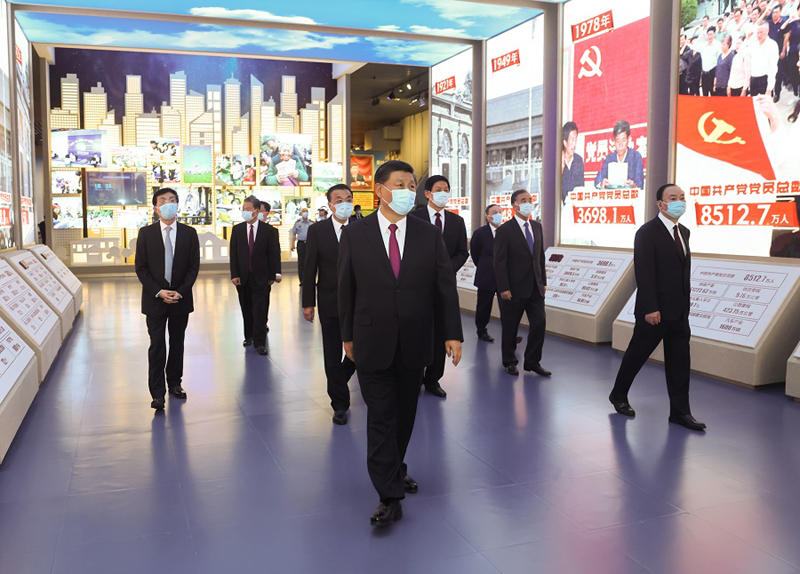 新近落成的中國(guó)共產(chǎn)黨歷史展覽館巍然矗立,氣勢(shì)恢宏。下午3時(shí)20分許,習(xí)近平等黨和國(guó)家領(lǐng)導(dǎo)同志來到這里,步入展廳參觀展覽。展覽以“不忘初心、牢記使命”為主題,精心設(shè)計(jì)了“建立中國(guó)共產(chǎn)黨 奪取新民主主義革命偉大勝利”、“成立中華人民共和國(guó) 進(jìn)行社會(huì)主義革命和建設(shè)”、“實(shí)行改革開放 開創(chuàng)和發(fā)展中國(guó)特色社會(huì)主義”、“推進(jìn)中國(guó)特色社會(huì)主義進(jìn)入新時(shí)代 全面建成小康社會(huì) 開啟全面建設(shè)社會(huì)主義現(xiàn)代化國(guó)家新(人民日?qǐng)?bào))征程”4個(gè)部分,通過2600余幅圖片、3500多件套文物實(shí)物,第一次全方位、全過程、全景式、史詩般展現(xiàn)中國(guó)共產(chǎn)黨波瀾壯闊的百年歷程,濃墨重彩地反映黨的不懈奮斗史、不怕犧牲史、理論探索史、為民造福史、自身建設(shè)史,使人們深刻認(rèn)識(shí)到紅色政權(quán)來之不易、新中國(guó)來之不易、中國(guó)特色社會(huì)主義來之不易,深刻認(rèn)識(shí)到中國(guó)共產(chǎn)黨為什么能、馬克思主義為什么行、中國(guó)特色社會(huì)主義為什么好。