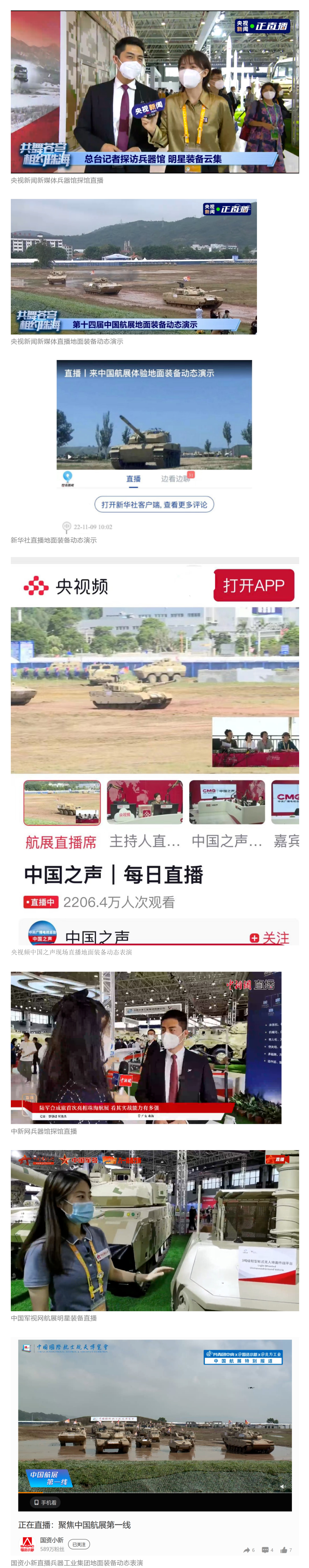央視新聞新媒體、央視頻中國之聲、新華社、中國新聞網(wǎng)、中國軍視網(wǎng)、CGTN(微博、臉書、推特)等媒體以及國資小新、共青團中央、鳳凰軍事等到兵器工業(yè)集團地面動態(tài)演示區(qū)、中國兵器館進行了直播。航展期間,集團公司微信視頻號、微博、抖音號、快手號共進行8次直播,最高觀看人數(shù)突破24萬。