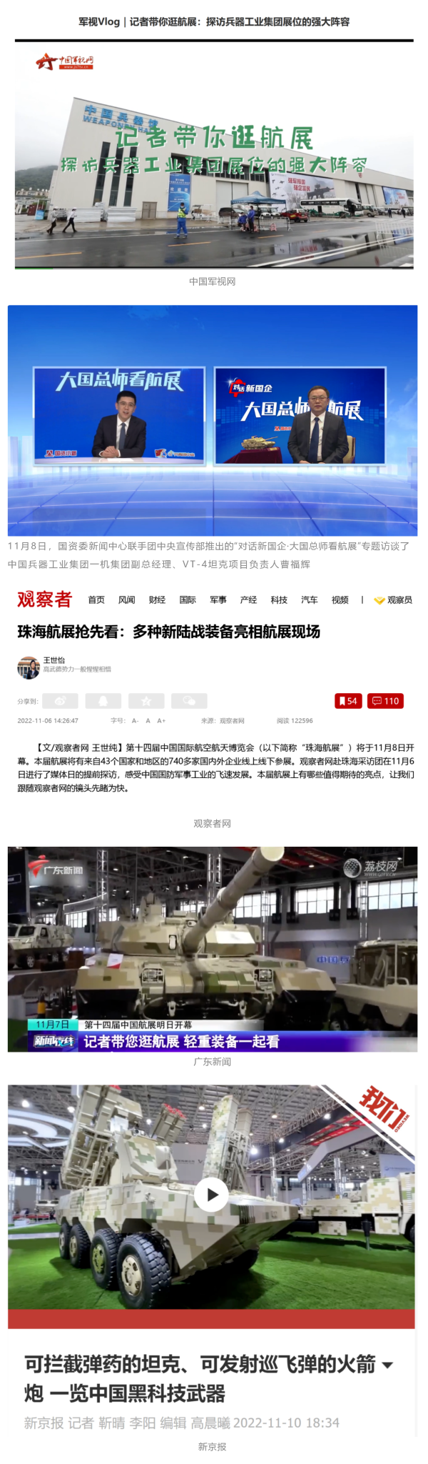 央視國防軍事頻道航展特別報道《炫舞天地間》11月12日《賞“鐵甲雄風(fēng)”!看航展地面裝備“鋼鐵洪流”名場面》對兵器工業(yè)集團武器裝備特色亮點進行報道?!秶儡娛略鐖蟆?1月7日推出報道《第十四屆中國國際航空航天博覽會明天開幕 中國兵器館首次以陸軍合成旅實戰(zhàn)體系形式展出》,對兵器館陸軍合成旅實戰(zhàn)體系進行報道。《軍事報道》11月9日推出《第十四屆中國國際航空航天博覽會 地面兵器裝備首次聯(lián)合陸航直升機進行動態(tài)展示》報道。《軍迷行天下》11月9日推出報道《軍迷打卡航展2022》以專業(yè)軍迷視角探館兵器館,全面展示兵器工業(yè)集團參展裝備特色亮點。
