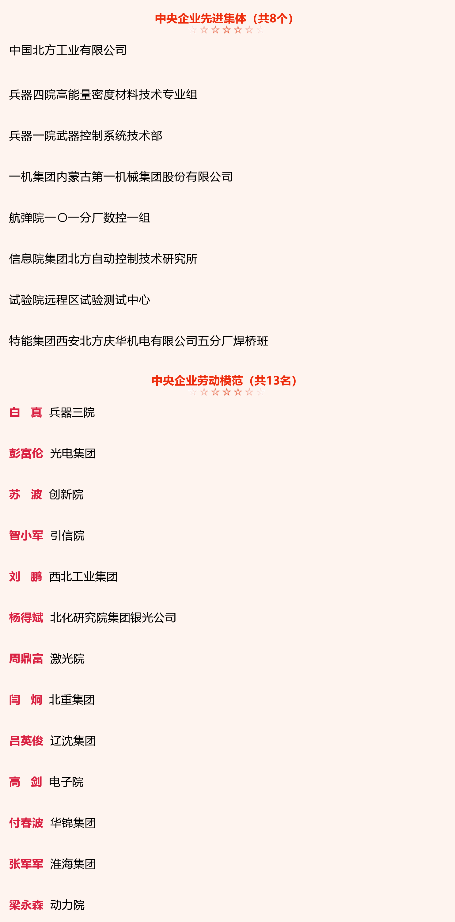 兵器工業(yè)集團(tuán)8個(gè)集體和13名個(gè)人獲中央企業(yè)先進(jìn)集體和勞動模范表彰 |