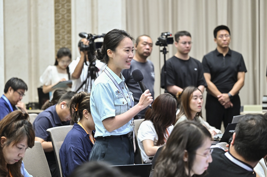 8月20日,國(guó)務(wù)院新聞辦公室在北京舉行新聞發(fā)布會(huì),閱兵領(lǐng)導(dǎo)小組辦公室副主任、中央軍委聯(lián)合參謀部作戰(zhàn)局少將副局長(zhǎng)吳澤棵,中國(guó)人民解放軍中部戰(zhàn)區(qū)閱兵指揮機(jī)構(gòu)辦公室常務(wù)副主任、政治工作部少將副主任徐貴忠介紹閱兵準(zhǔn)備工作有關(guān)情況,并答記者問。這是記者在現(xiàn)場(chǎng)提問。